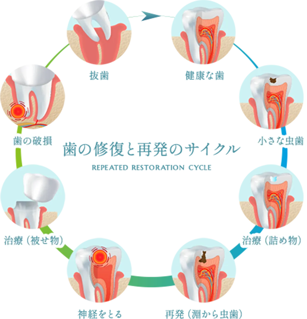 いったんむし歯になると、治療のために歯を削ることになります。しかし、歯は一度削ってしまえば、それが自然に戻ってくることはなく、再発すればどんどん進行度が上がり、修復と再発を繰り返すことになるため、疾患部を削っては、ふたをして、また削り、やがて歯は抜歯へと進んでいきます。